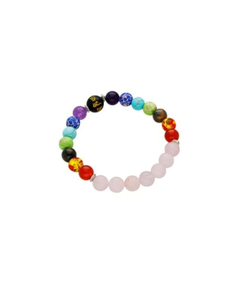 Esta pulsera porta doblemente las 7 piedras de Chakra, además de una banda de bolas de cuarzo rosa. El día de las bolas de piedra natural es de 8 mm. La bola central está grabada con los símbolos de Chakras y tiene un diámetro de 10mm. La medida es elástica y ajustable.